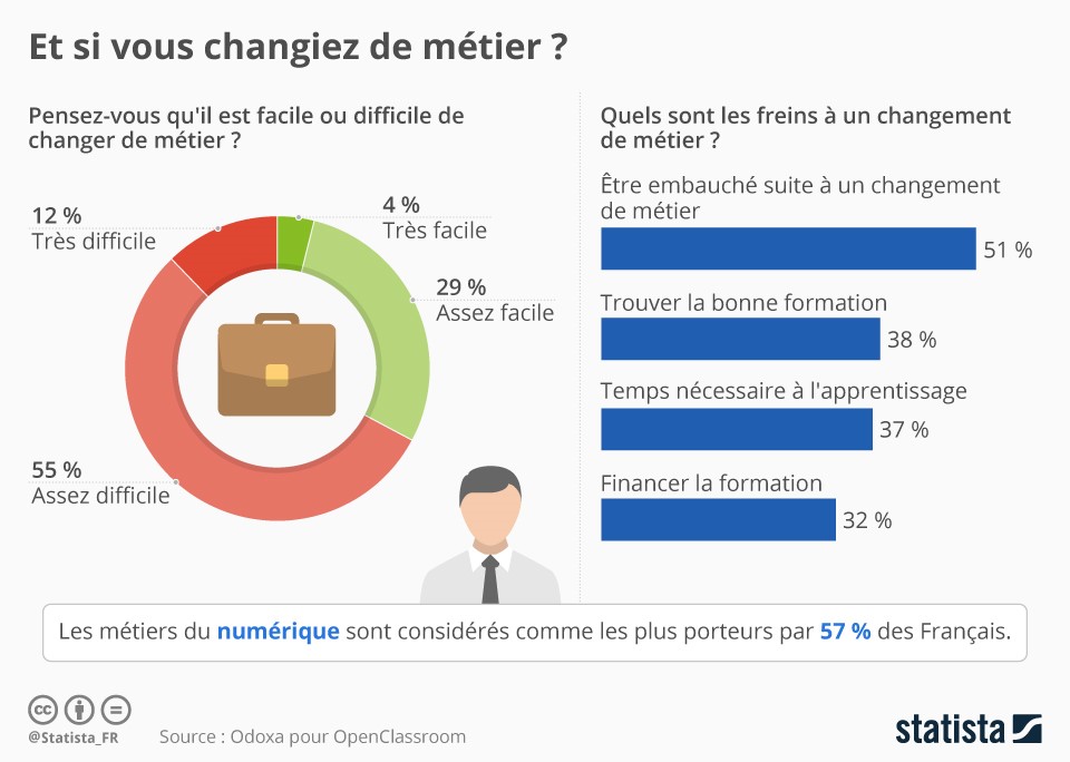 - Changer de métier reste difficile pour 67 % des français. Ils pensent que les employeurs sont réticents à accueillir une personne qui voudrait se reconvertir.