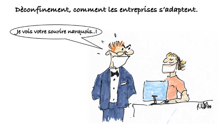 Dans de nombreuses entreprises et administrations, des panneaux rappellent les gestes barrières et des kits sanitaires ont été distribués. D’autres ont organisé la pause repas dans les cantines avec réservation obligatoire, horaires fixes par étages, lunch box à déguster à sa table de travail. D’autres enfin ont équipé les véhicules avec des plexiglas de protection entre le conducteur et le passager et les ouvriers gardent chacun leurs propres outils.