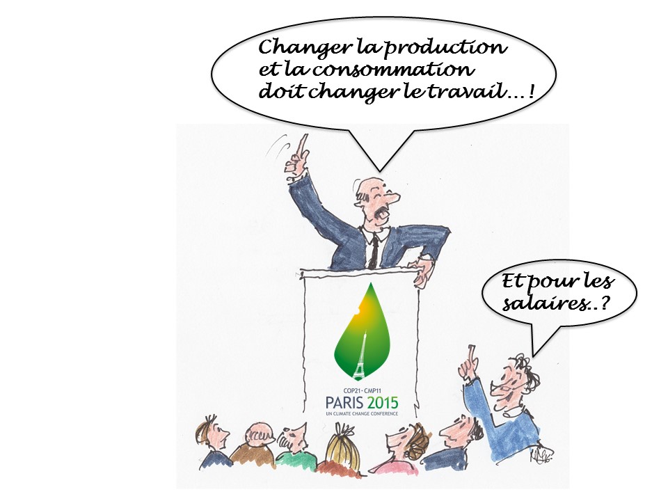 Car c’est de cela dont il faut parler, le « comment faire » loin du Bourget. Comment diminuer drastiquement notre consommation d’énergie fossile, développer les énergies renouvelables, engager l’économie sur la voie de l’éco-efficience et du développement durable ? Or, engager avec succès les changements nécessaires de nos modes de production et de consommation entraîne parallèlement des changements dans les façons de travailler et dans les emplois. Guy Rider, Directeur général de l’OIT a écrit dans une tribune récente que « l’environnement n’est pas un problème pour l’emploi, c’est l’emploi qui est une solution pour l’environnement ».