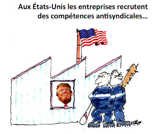 Aux USA, depuis la fin des années 70, on a assisté à une vaste offensive antisyndicale. C’est même devenu un business avec des consultants, des juristes ou des psychologues du travail. Toute la panoplie des pratiques antisyndicales sont utilisées : briser une grève, manœuvres dilatoires pour retarder des actions en justice, surveillance ou fichage des syndicalistes, licenciements des militants…