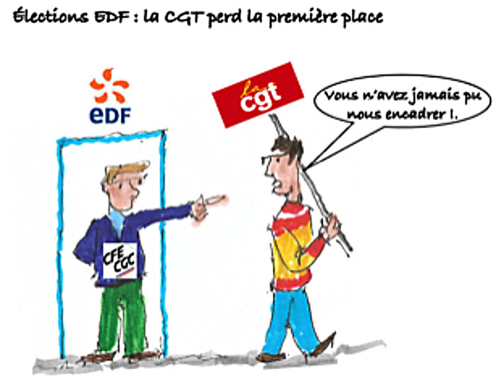 La CGT détenait la première place depuis 1946, date de la création d’EDF. Sa perte d’audience particulièrement importante cette année confirme une tendance de fond enregistrée depuis 2007 où elle détenait encore la majorité absolue avec 51 %.