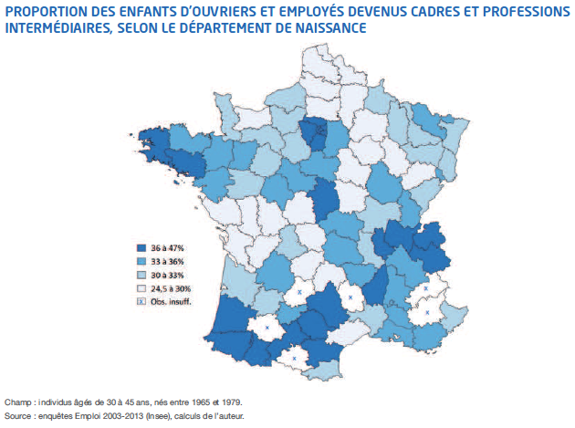 Les travaux sociologiques ont montré que le taux de mobilité ascendante a progressé en 25 ans (25 % pour les générations 1950-1964 ; 33 % pour les générations 1965-1979). Mais les écarts entre régions, entre départements perdurent.
