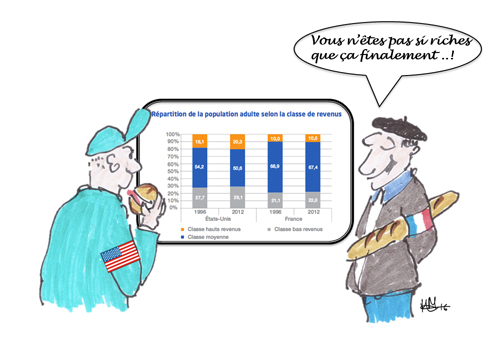 « L’importance de la classe moyenne française provient essentiellement d’inégalités économiques moins fortes », note France Stratégie. Les États-Unis, eux, se singularisent à l’inverse par une plus forte proportion de « bas revenus » (presque 30 % en 2012 contre seulement 22 % en France) mais aussi par une part plus élevée de ménages à « hauts revenus ».
