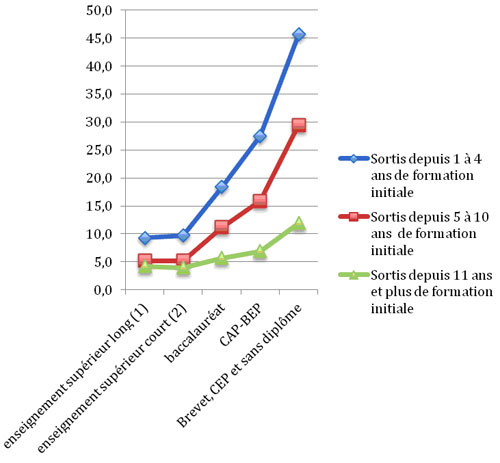 En %, selon le diplôme et la durée écoulée depuis la fin de la formation initiale