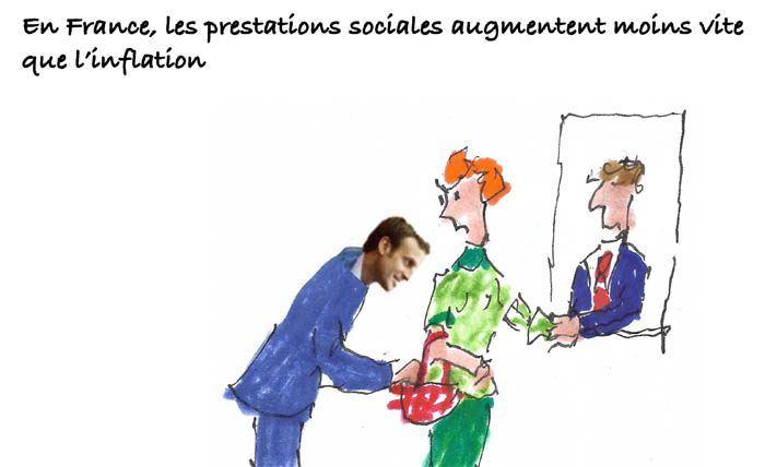 En France, les prestations sociales augmentent moins vite que l’inflation : 849 milliards d’euros consacré à la protection sociale, soit +1,7 % par rapport à 2021 avec une inflation en 2022 de +5,2 %.