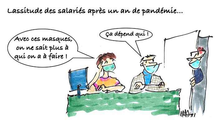 Toutefois, quand on demande quel mot exprime le plus leur état d’esprit, les salariés choisissent « la lassitude » (48 %) loin devant « l’inquiétude » (28 %) et « la patience » (35 %). La « colère » n’est exprimée que par 16 % des salariés. C’est plutôt « la résignation » (22 %) et « l’impuissance » (24 %) qui viennent à la suite. Comme si les salariés subissaient la crise avec le sentiment de ne pas avoir prise sur elle. S’ils sont peu inquiets pour eux-mêmes, ils semblent plus soucieux de l’état psychologique de leurs collègues qui, pour 61 % d’entre eux, s’est dégradé du fait de l’angoisse face à l’avenir, la dégradation des interactions sociales et l’isolement, plus que sur les risques de contamination.