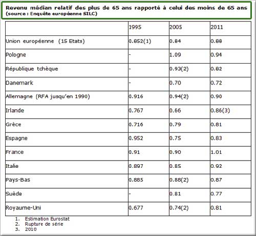 On voit que dans ces pays, le niveau de vie des plus de 65 ans est nettement plus faible que celui de l’ensemble de la population. L’écart est de 7 % en Autriche, de 8 % en Italie, de 10 % en Allemagne, de 13 % aux Pays-Bas, de 17 % en Espagne. Il approche les 20 % en Grande-Bretagne, et les dépasse en Suède, Belgique et au Danemark (28 %).