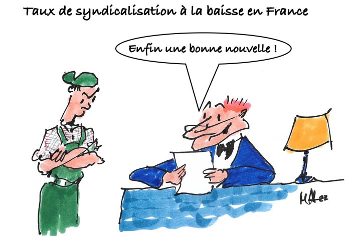 Le taux de syndicalisation n’évolue guère depuis la fin des années 80 autour de 10 %. Même s’il n’a jamais atteint des niveaux très élevés en France contrairement à d’autres pays européens, il se situait tout de même à un peu moins de 20 % à la fin des années 60 jusqu’en 1978 et autour de 30 % durant la période de l’après-guerre.