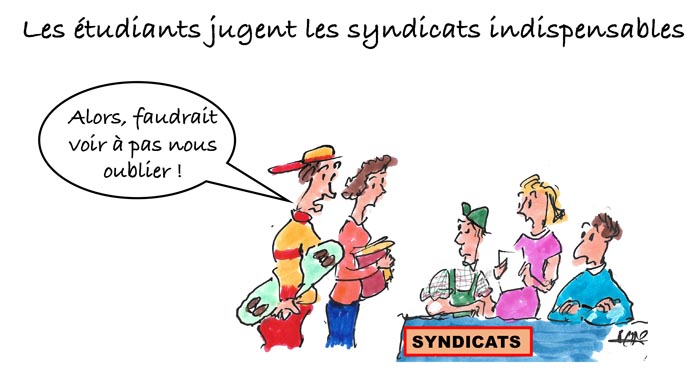 Le syndicalisme est principalement associé à des qualificatifs velléitaires : « défense », « grève », « CGT », « revendications ». Les termes « discussion », « dialogue », « équilibre », « travail » sont peu utilisés par les étudiants quand ils parlent des syndicats. La grève est considérée à 80 % comme « une tradition française » et constitue un échec pour 60 % des étudiants.