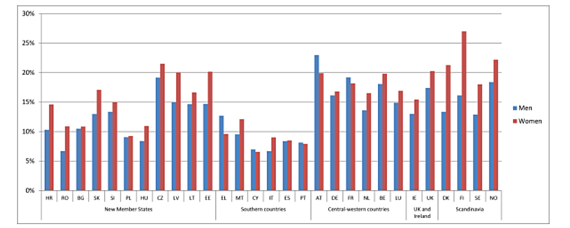 On voit que la proportion de femmes européennes sujettes (15,1 %) à ce problème est plus forte que celle des hommes (13,3 %) dans la plupart des pays d’Europe, avec un écart plus important dans certains pays scandinaves et baltes. Le graphique montre aussi le plus faible taux, hommes ou femmes, des pays du sud : moindres exigences productives ? moindre prise de conscience ?