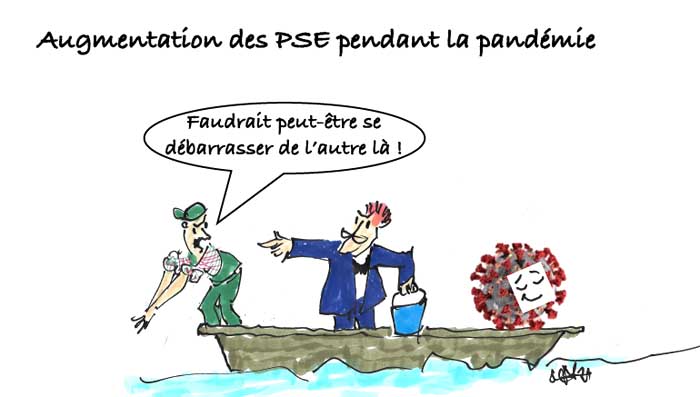 De mars 2020 à fin mai 2021, 1 050 PSE ont été initiés, envisageant 106 500 licenciements. De mars à fin octobre 2020 déjà, le ministère du Travail avait annoncé 657 PSE envisageant 62 000 licenciements, contre 369 et 25 500 à la même période de 2019. Cependant, c’est moins que lors de la crise de 2008-2009 qui, sur l’année 2009, avait connu 303 610 licenciements économiques, dont ceux de 2 647 PSE notifiés (sans que l‘on connaisse le nombre de leurs licenciements, non transmis à l’administration du travail jusqu’en 2013).