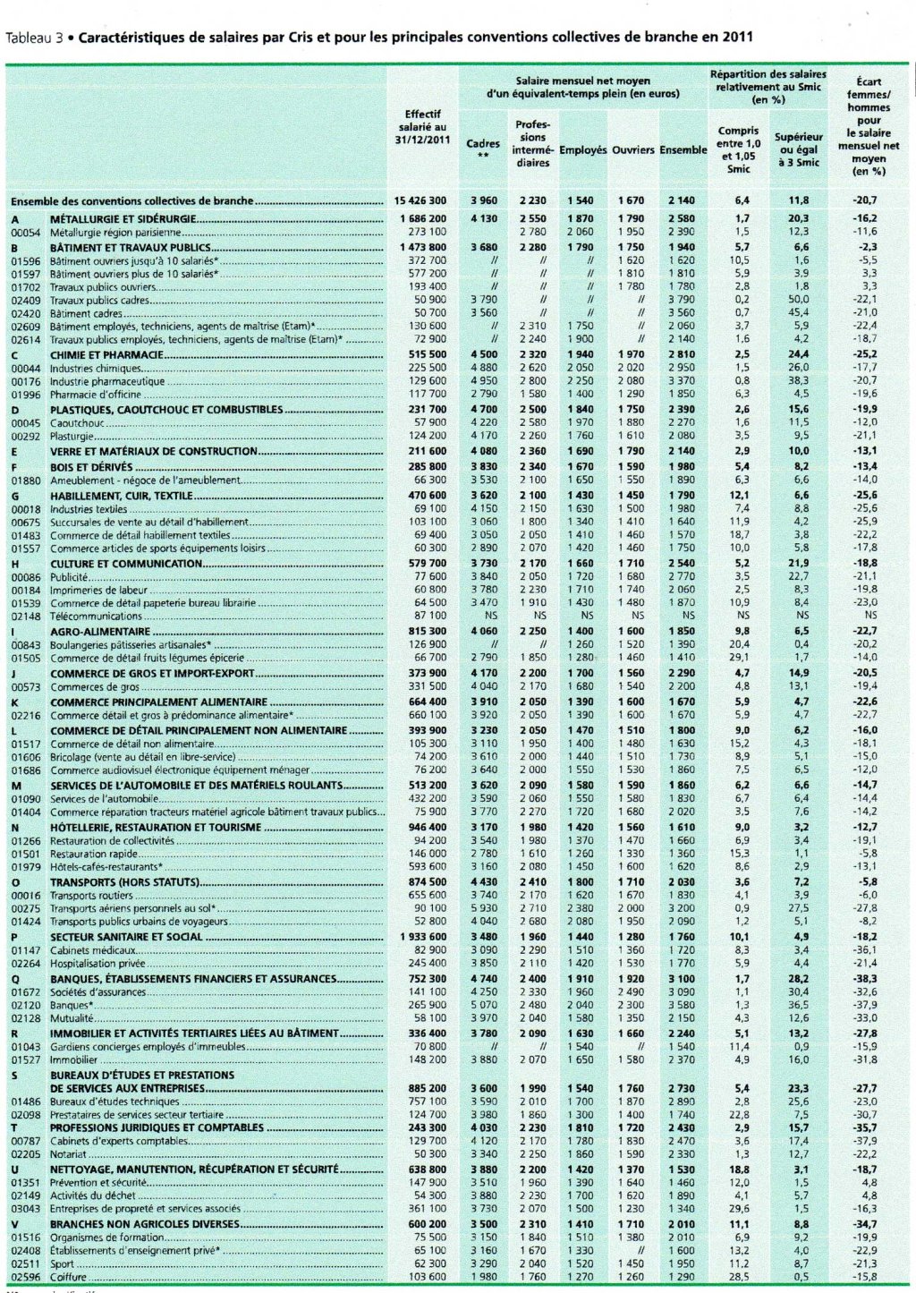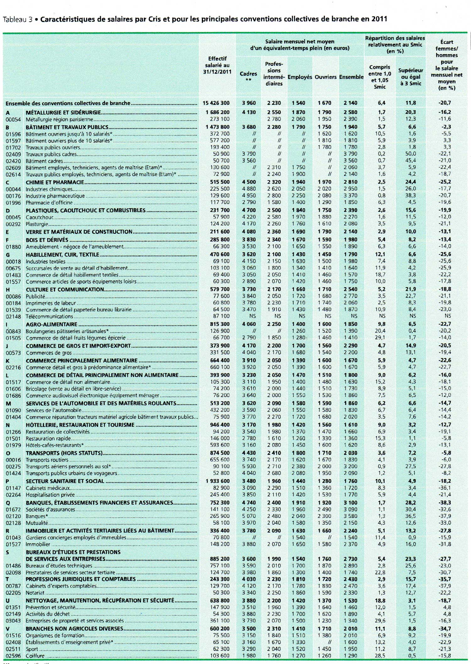S’agissant des salaires, le salaire mensuel net moyen est de 2 140 euros en 2011. Il est de 20,7% inférieur en moyenne pour les femmes. Sur ce thème aussi on trouvera des différences marquantes entre les branches pour ce qui est de la proportion des bas salaires (entre 1 Smic et 1,05 Smic), la chimie et la métallurgie n’en ayant que 1,5 % par exemple contre près de 30% dans la coiffure et le secteur de la propreté.