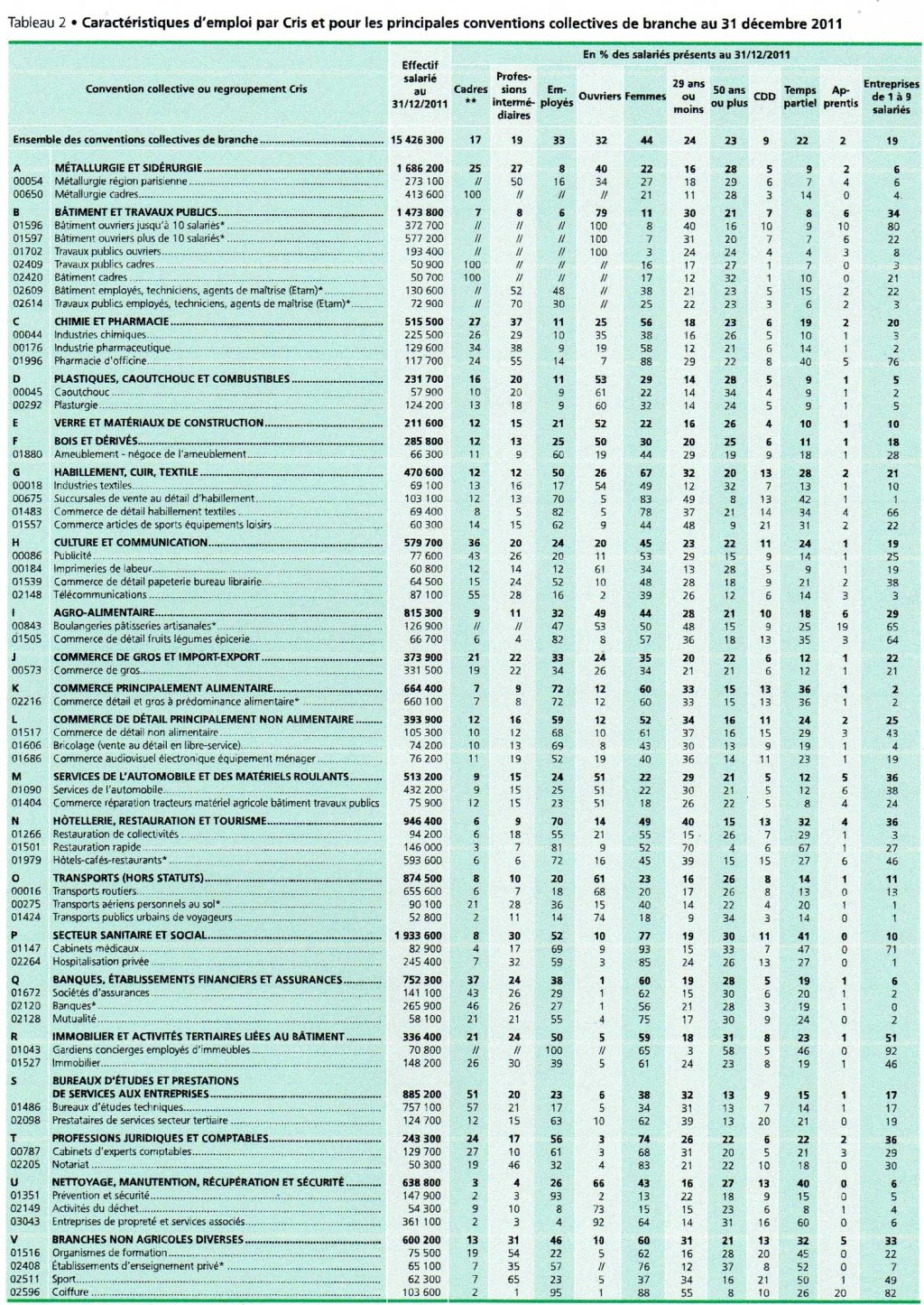 1. Les caractéristiques d’emploi pour les principales conventions collectives de branche au 31 décembre 2011.