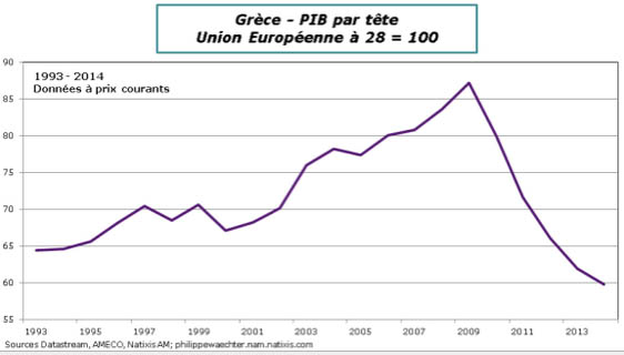 L’importance de la dette, les mesures imposées pour assainir le pays, la multiplication du chômage, la baisse des salaires et des retraites, au final la chute du niveau de vie et la baisse de la consommation, tout a concouru à entraîner une forte baisse du PIB, qui ne retrouve un peu de croissance qu’en 2014.