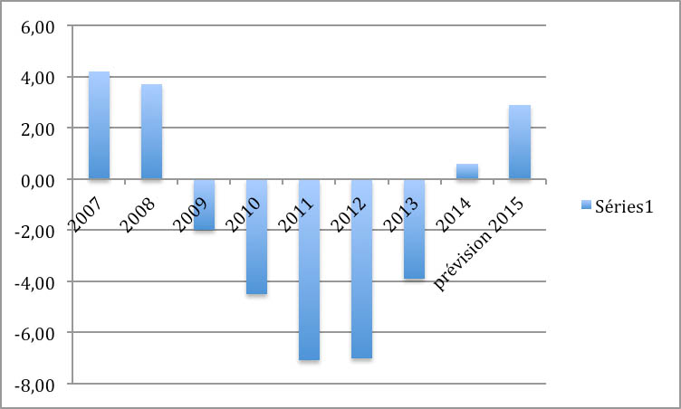 Ces statistiques sont claires pour montrer l’importance de la chute du PIB et donc la récession depuis les années de crise. L’appareil économique était déjà en situation de retard face à l’évolution des techniques, des activités de production et des marchés. Or la productivité a baissé de près de 9 % en 10 ans. L’économie est exsangue.