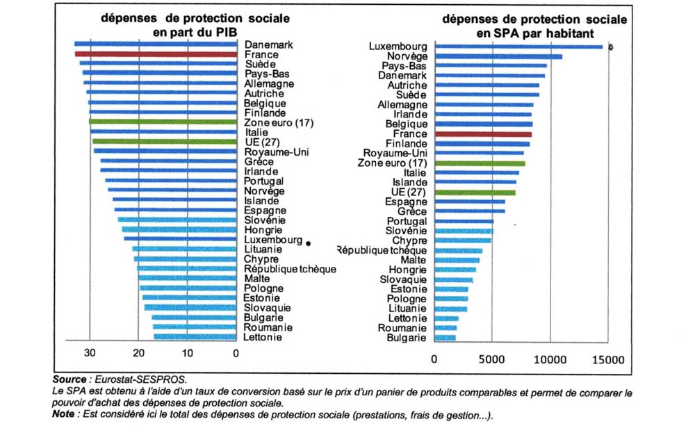 Pourtant, au sein de l’Union européenne, on constate des situations différentes. Le poids des dépenses de protection sociale varie quasiment du simple au double (33,4 % pour le Danemark contre 16,78 % en Lettonie, avec une moyenne européenne à 28,4 % en 2009). En tête du classement les pays riches (France, Allemagne, pays d’Europe du Nord) et en bas les nouveaux entrants (Lettonie, Roumanie, Bulgarie). Cependant le Royaume-Uni, avec un PIB supérieur, consacre 3,5 points de PIB en moins aux dépenses de protection sociale.