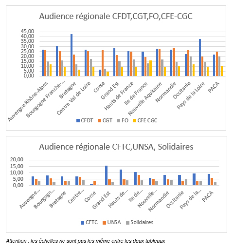 Autre progression importante de la CFDT, en Nouvelle Aquitaine (+1,61 point), elle ravit la première place à la CGT avec 0,14 point d’avance. Avec une progression de près de 1 % elle devient aussi première organisation dans les Hauts-de-France, région pourtant au passé glorieux pour la CGT. Malgré une légère perte de 0,13 point, elle passe aussi devant la CGT en Auvergne-Rhône-Alpes. Au total, la CFDT progresse dans 7 régions sur les 13 régions métropolitaines. Elle dépasse les 40 % en Bretagne (42,50 %). A contrario elle enregistre ses plus mauvais scores dans les régions PACA (22,11 %), Occitanie (22,27 %), et Corse (6,70 %) où elle perd du terrain.