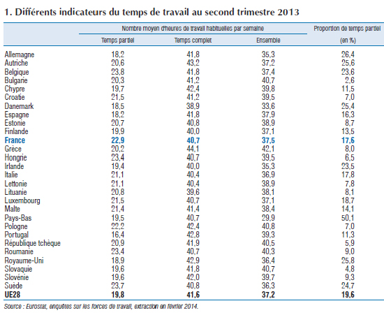 – En moyenne dans l’Union européenne à 28, la durée habituelle hebdomadaire de travail pour l’ensemble des salariés (à temps complet et à temps partiel) s’établit à 37,2 heures au second trimestre 2013. Elle varie entre 29,9 heures aux Pays-Bas et 42,1 heures en Grèce. La durée hebdomadaire du travail est généralement plus faible dans les pays du nord de l’Europe et plus élevée dans les pays d’Europe centrale et orientale. La France a une durée équivalente à la moyenne européenne.