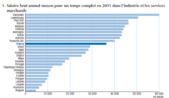 – Dans l’Union Européenne à 27, en 2011, le salaire brut moyen d’un salarié à temps complet dans l’industrie ou les services marchands est compris entre 4 700 euros par an en Bulgarie et 60 000 euros par an au Danemark, soit près de 13 fois plus. Dans l’ensemble, le salaire brut annuel moyen est inférieur à 12 000 euros dans la plupart des pays baltes et de l’Europe centrale et orientale, compris entre 16 000 et 30 000 euros dans les pays du sud de l’Europe et supérieur à 30 000 euros dans les autres pays de l’Union. La France est en onzième position, entre le Royaume-Uni et la Grèce.